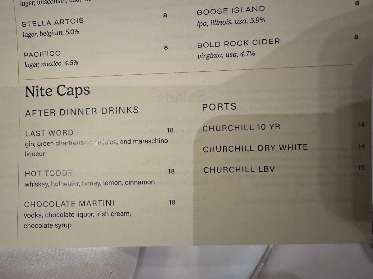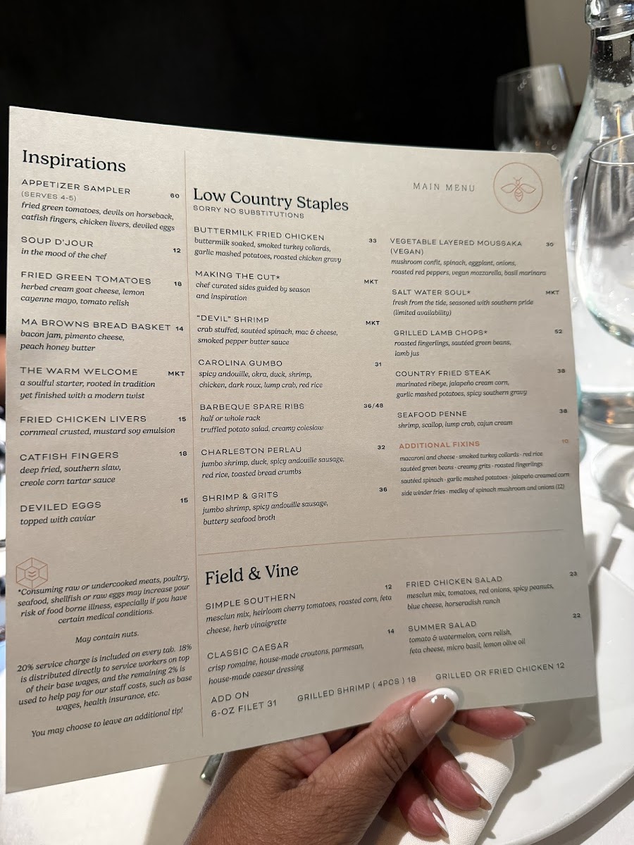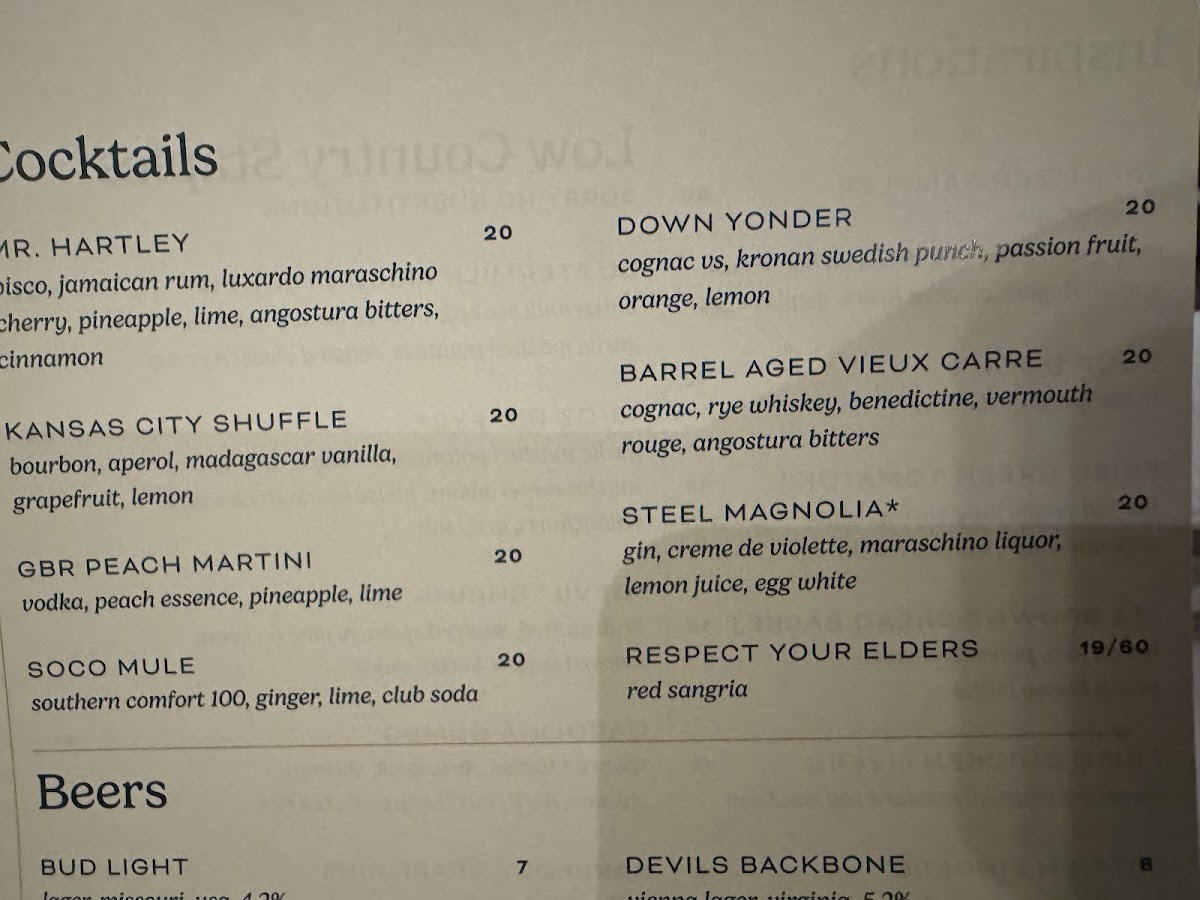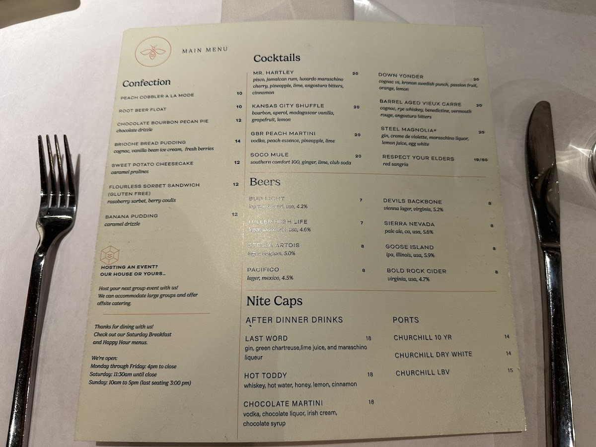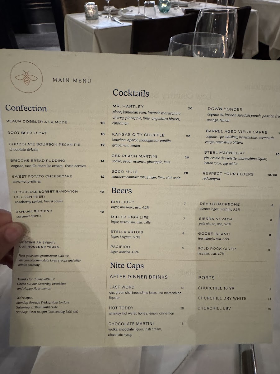 The menu is a treasure trove of classic dishes that evoke a sense of nostalgia and comfort. Savor the Sweet Potato Cheesecake that strikes the perfect balance between rich and creamy, making every bite melt in your mouth for just $12. For the ultimate indulgence, try the Brioche Bread Pudding, served with cognac and vanilla bean ice cream, fresh berries, all for $14. And let’s not forget the crowd-favorite Peach Cobbler, a delightful dessert paired beautifully with velvety vanilla bean ice cream – a true treat for the senses at $10.